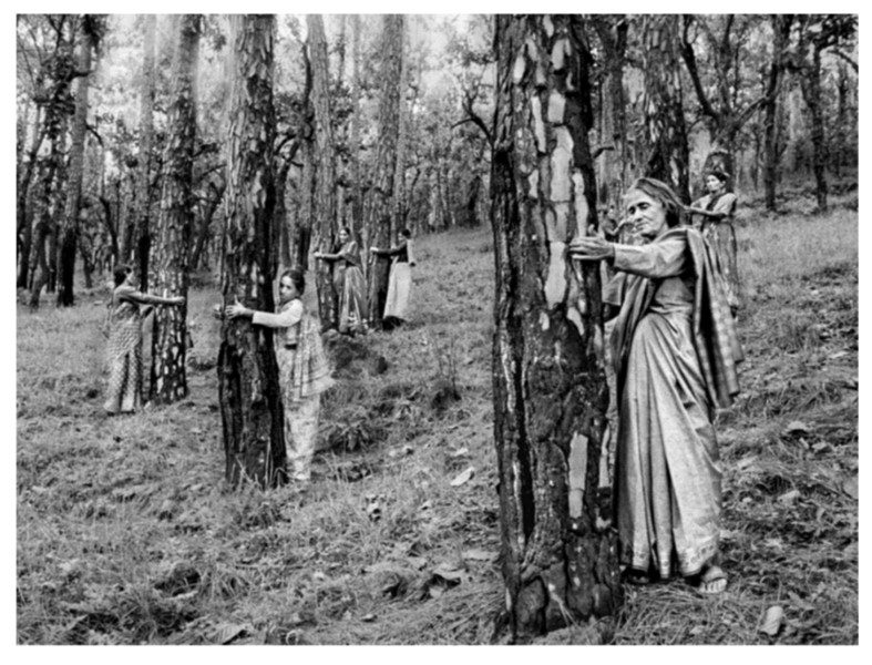 En 1974, una campesina, Gaura Devi, organizó una resistencia no violenta en la que animó a todas las mujeres de su aldea a abrazar los árboles para impedir su tala. Posteriormente se investigaron las consecuencias ambientales y se prohibió la tala durante 10 años. Acciones similares se extendieron hasta 1979 por más de un centenar de aldeas del norte de la India y se llevaron a cabo otros movimientos simbólicos y pacíficos orientados tanto a proteger los bosques locales como la naturaleza a nivel global. Como escribió en 1982 la socióloga Shobita Jain: “Las mujeres que han participado en el movimiento chipko han tomado conciencia de sus potencialidades y exigen una participación en el proceso de adopción de decisiones a nivel de la comunidad”.